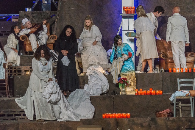 Una donna in nero, un’Addolorata, avanza a un certo punto, “nazzecando”, dondolandosi con il passo classico delle processioni tarantine del giovedì e del venerdì santo. Lumini dappertutto si accendono. Qualcuno nasce, mentre ai piedi del palco ci sono cumuli di terra come tombe con piccole croci, e i vagiti si fanno più forti e le donne portano i bambini verso il pubblico e li scopriamo pezzi di pane, che vengono offerti. Vita-morte; morte-vita. Sul palco la vita continua, continua, sempre uguale, ripetitiva, forse senza soluzione e senza speranza, fino al compleanno di un centenario, con torta candeline e grida festose, e vecchi ai banchi di scuola, e ancora le azioni della nuda esistenza che si reiterano come un brusio infinito, snervante, senza salvezza, fino a che tutti non alzano il capo e si immobilizzano a guardare il cielo, e le croci si infiammano, e i fumi, e questo popolo desolato non inizia un altro esodo, con candele votive, dietro alla banda, non si sa verso dove. E una voce, l’unico altro testo rimasto in una drammaturgia che ha rinunciato in corso d’opera a evocare il Paradiso di Dante come avrebbe voluto, ci lascia senza speranza: “Ce ne andiamo… restituiamo alla natura quello che ci ha prestato… il nulla davanti a noi non è più spaventoso di quello che ci sta alle spalle…”. Bouvard e Pécuchet nel paradiso sognato: la vita banale, quella nella quale ci crogioliamo, quella in cui speriamo, dove abbiamo sempre qualcosa da desiderare o qualcosa da rimpiangere (momento struggente è quando una ragazza canta l’aria di Barbarina delle Nozze di Figaro, “L’ho perduta… me meschina. / Ah, chi sa dove sarà…”): illusioni, certezze sotto fumi di morte, in una realtà avvelenata che dipingiamo come meravigliosa per sopportare la fatica di sopravvivere.