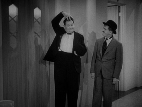 Stan è Ollie, Ollie è Stan. Sembra di rivedere la scena finale di un loro film, Thicker than water, quando, a seguito di una trasfusione di sangue, i due si ritrovano con le caratteristiche invertite: il magrolino con la cravatta e i baffetti del grassone, e questi che piagnucola e si gratta la testa secondo l'inconfondibile stile del compagno.