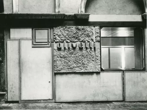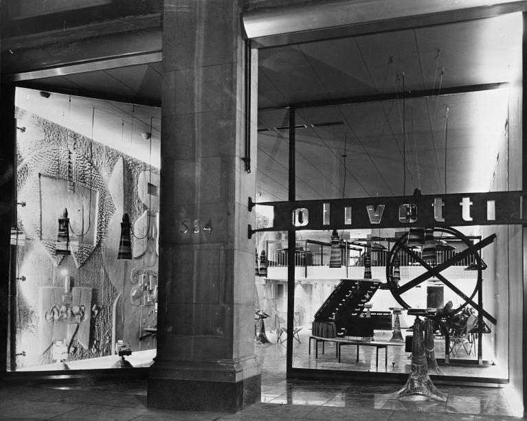 Il battage critico gli fece vincere il Premio Olivetti nel 1956, da cui scaturì la commessa del Negozio Olivetti di Venezia, che poi era un “biglietto da visita”, uno showroom, che l’azienda di Ivrea apriva al mondo. Difficile dire se il risultato sia più “scarpiano” (uso dei materiali tradizionali e locali, disposizione degli spazi) o “olivettiano” (la continuità tra esterno e interno, l’uso di opere d’arte, il messaggio implicito di una cultura aziendale). Certo un capolavoro dell’architettura del Novecento. Il rapporto di Scarpa con l’azienda d’Ivrea prosegue con l’allestimento della mostra Frescoes from Firenze, voluta dalla Olivetti dopo l’alluvione del 1966 e primo caso di sponsorship culturale, curata da Scarpa nella tappa londinese presso la Hayward Collection.