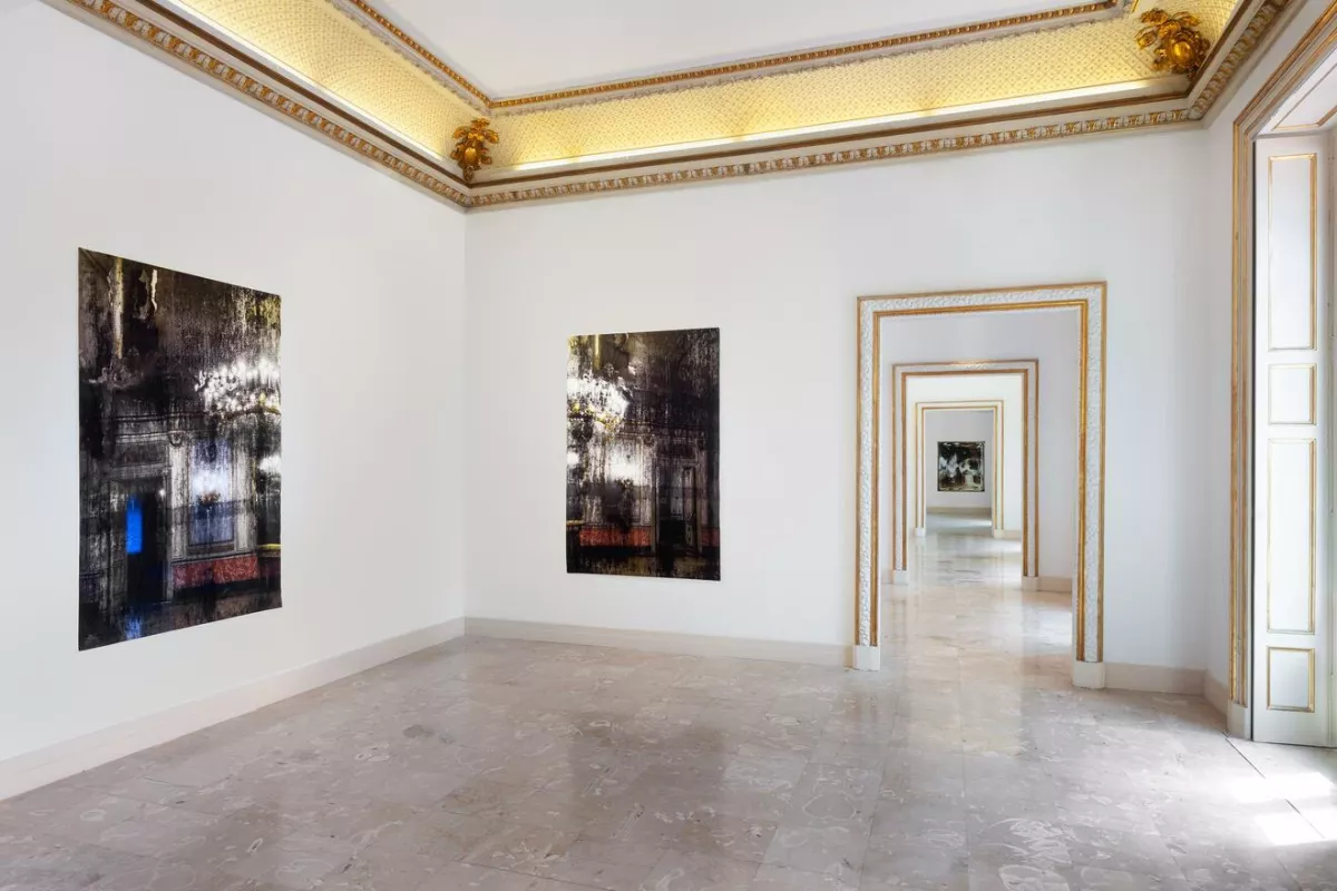 Si percorre la mostra come in un crescendo, non perché le opere siano più efficaci via via che si procede nelle sue otto sale, bensì perché lo sguardo si fa progressivamente più attento. Le opere agiscono come dispositivi spazio-temporali, sussurrano di presenze che tornano a mostrarsi in una sala da ballo dimenticata (il riflesso delle grandi specchiere ossidate della Sala da Ballo della Villa) e a palpitare nei corpi dei guerrieri e delle dee di marmo. Vedere una fotografia è sempre un rivedere, è una traccia di qualcosa che è stato o ancora è, ma sempre necessariamente altrove. Il processo di “ritornanza” presuppone un indugio, una verifica da parte di chi osserva: “la fotografia è un luogo di immagini incerte”, dice Hans Belting, e Sighicelli lavora sulla fertilità propria di quell’incertezza, su quell’indecisione temporale che crea una corrugazione nelle pelle del tempo, un’increspatura che manda alla malora il nostro essere sempre schiacciati sul presente. Forse siamo ancora dentro Doppio Sogno, e Storie di Pietròfori e Rasomanti ne è la naturale prosecuzione, di cui attendiamo il capitolo conclusivo dedicato a Villa Cerruti, altra casa-museo nata dalla passione collezionistica nutrita in assoluto segreto dall’industriale della legatoria Francesco Cerruti.