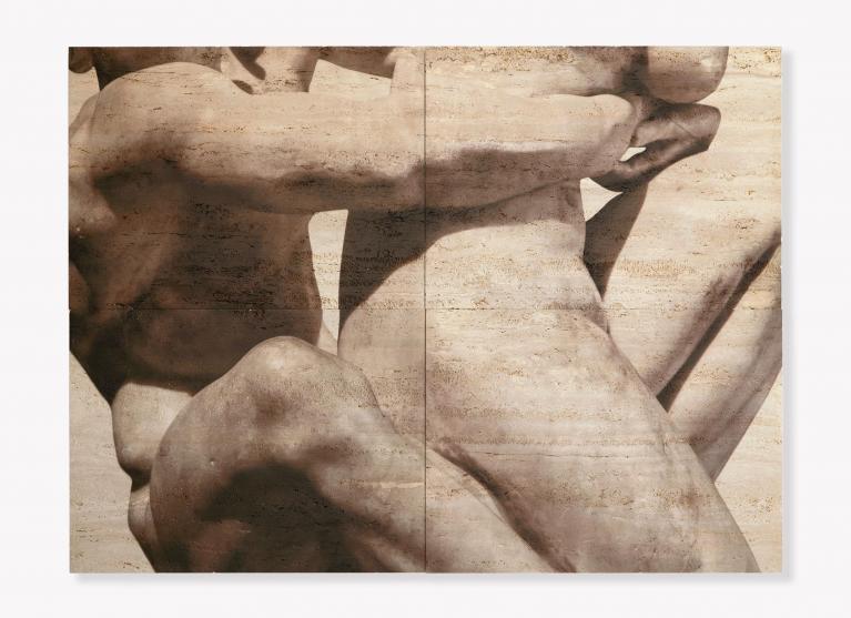 Per la prima volta nel lavoro di Sighicelli questa tensione si rivela in maniera così chiara – forse anche perché inaspettata – e non priva di una sottile forma di violenza. Così sottile da sembrare una semplice suggestione nelle prime due opere, dove viene ripreso un trapezoforo appartenente alla collezione del Museo Archeologico di Napoli, che raffigura un uomo stretto nelle spire di un mostro marino. Le opere mostrano due lati del trapezoforo creando un effetto straniante, il quadro percettivo si confonde e viene suggellato l’ingresso in quel regime di alter-realtà a cui l’artista conduce lo spettatore attraverso le sue “sculture fotografiche”. Solo procedendo nel percorso l’intuizione iniziale si rivela fondata: il rifacimento – o reload, se vogliamo – di un dipinto su carta di sapore pompeiano, montato su vetro e danneggiato, già appartenente alla collezione del Museo, crea un primo punctum nel percorso espositivo. Sighicelli ha fotografato l’opera e l’ha riprodotta su vetro, ricostruendo in maniera mimetica le spaccature dell’originale. Dice che “la violenza è alla base della tradizione figurativa occidentale” ed è proprio lì, nel ratto (come si vede nelle opere della penultima sala), nel sacrificio rituale, nelle immagini delle battaglie che l’iconografia ha trovato il substrato per germogliare e costituire l’albero della tradizione figurativa occidentale. L’erotismo intrinseco all’atto della visione affonda le radici nell’humus della rappresentazione della violenza, ma nei secoli l’arte ha mondato la brutalità, sublimandola. È sempre una questione di linguaggio: di quelle lontane visioni di sangue, oggi rimane solo una labile traccia di cui quasi non abbiamo più cognizione, e della violenza in effige rimane solo un guscio vuoto. Siamo preda di una stanchezza del vedere quando l’arte, ormai priva di qualunque residuo di sacro, diventa cronachistica, quando ricerca l’oltraggio, ma anche quando abdica alla rappresentazione e si rarefà fino a negarsi. Una stanchezza che è vuoto di senso e, in prima istanza, vuoto di forma. Qualcosa invece si risveglia qui di fronte allo zoccolo levato di un cavallo, nelle mammelle come frutti maturi di una divinità femminile, nella tensione muscolare di un soldato. Figure che hanno subìto una rilocazione ma che ci appartengono collettivamente e Sighicelli, come un admonitor, ci indica dove guardare. L’immagine riprodotta può compiersi senza tautologia e rapire il nostro sguardo, trattenerlo, come una possessione. Si sta lì, in attesa che il mistero si sveli, presi dalle immagini che tornano dagli altrove, ed è un viaggio nella memoria visiva collettiva, dove tutto ci è familiare eppure sconosciuto, un vero superimposed, perché non esiste una vera cesura tra le opere, che si legano l’una all’altra e portano avanti un discorso ininterrotto, come un flusso di fotogrammi o come una sola, grande installazione.
