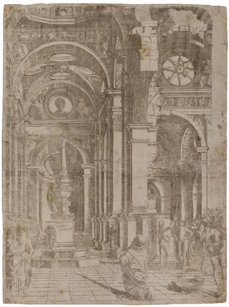 Bernardo Prevedari, Interno di un tempio con figure, bulino, 1481. Civica Raccolta delle Stampe Achille Bertarelli, Milano.