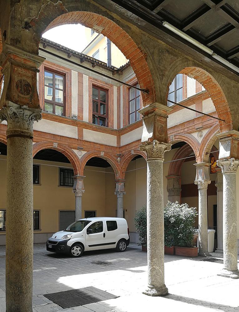 I resti di un’esperienza di avanguardia nell’edilizia civile milanese si trovano dietro i bidoni della spazzatura al civico 29 di corso Magenta. Lo segnala la storica dell’architettura Roberta Martinis nel saggio Anticamente moderni. Palazzi rinascimentali in Lombardia in epoca sforzesca (Quodlibet, Macerata 2021).