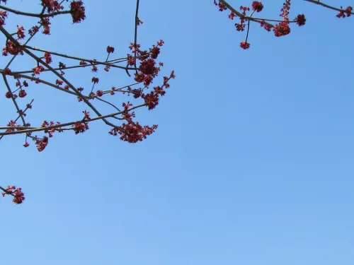Giocano d’anticipo gli aceri rossi e gli aceri saccarini. Sono i primi a fiorire sul finire dell’inverno, prima delle chiassose gialle forsizie, segno certo della primavera. Sanno che i loro minuscoli corimbi non possono rivaleggiare con le corolle di seta dei fruttiferi o con quelle carnose e sensuali delle magnolie. La loro strategia amorosa punta perciò sul tempo: sin dalla fine di febbraio concentrano tutto il loro potere attrattivo nei numerosissimi, microscopici stami rossi. Devono garantirsi l’impollinazione offrendo agli insetti un primo dolce bottino: attaccati alla corteccia, stretti in gruppi, i fiorellini richiamano anche il nostro sguardo. Difficile in questo periodo dell’anno distinguere un acero rosso dal parente con cui spesso si ibrida e che gli americani chiamano silver maple (acer saccharinum). Da lontano, rami nudi alonati di sanguigna sono indizio d’acero saccarino; se la matita vira verso un intenso cremisi è più probabile si tratti di acero rosso. Ma solo un’osservazione ravvicinata può fugare i dubbi: cinque petali, cinque sepali, due stili allungati, seppure in miniatura, fanno la differenza nella resa cromatica e nell’effetto d’insieme dell’acer rubrum. Poi, foglie e frutti (samare) renderanno sicuro il riconoscimento. Il saccarino mette foglie dal verso argentato con lobi più incisi, samare più lunghe e asimmetriche rispetto a quelle del cugino rubesto che, per non farsi mancare niente e giustificare il nome, le sfoggia tinte anch’esse. Altra cosa è l’acer saccharum (sweet maple) dalla cui linfa gli indiani d’America estraggono con maggior abbondanza lo sciroppo per le ciambelle.
