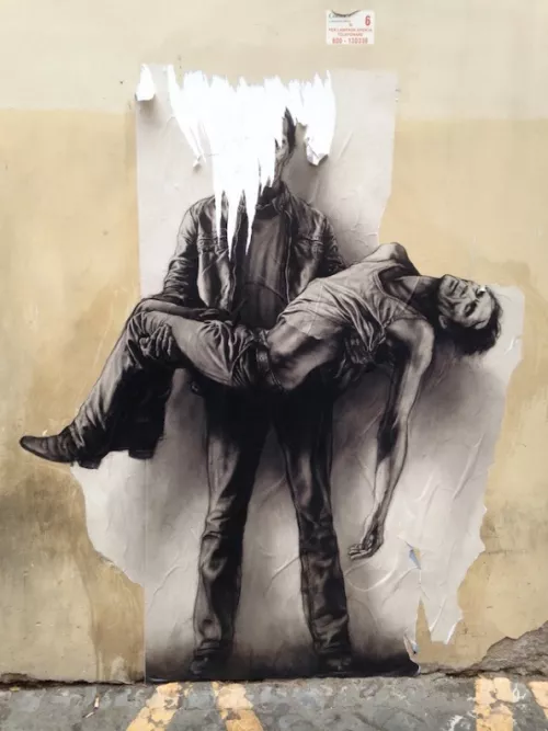 Ma torniamo a noi. Cosa farne, in chiusura, di questa street art? Prese insieme, le opere commentate sono frammenti disciolti, urla sparse che si inseriscono nel quotidiano per poi scomparire nel vortice della realtà con rapidità tale che ci rimane a malapena un ricordo fuggente, un’impressione nella memoria. Il suo tallone d’Achille.