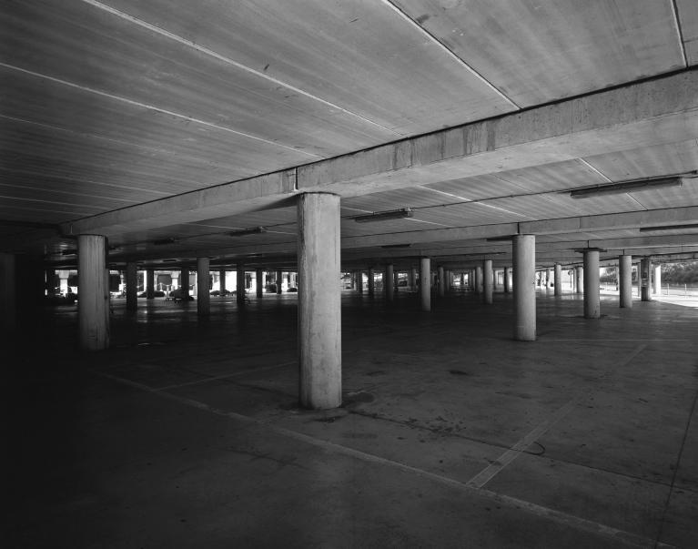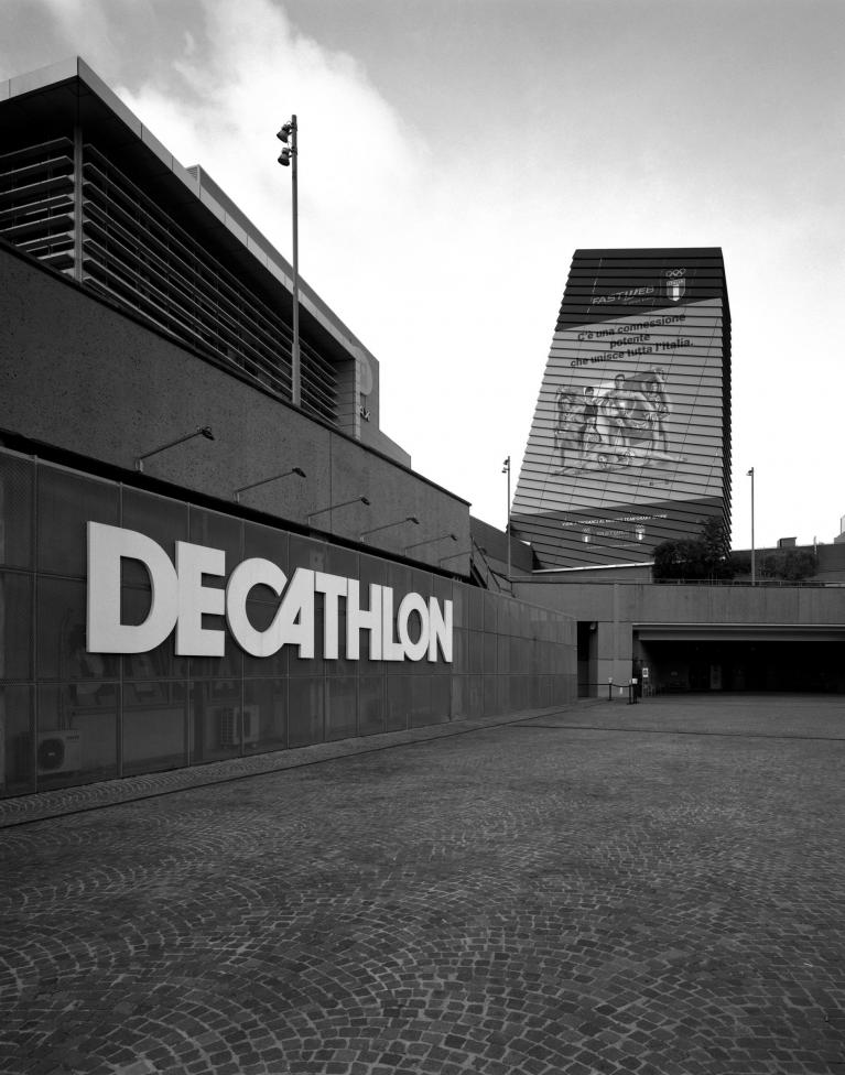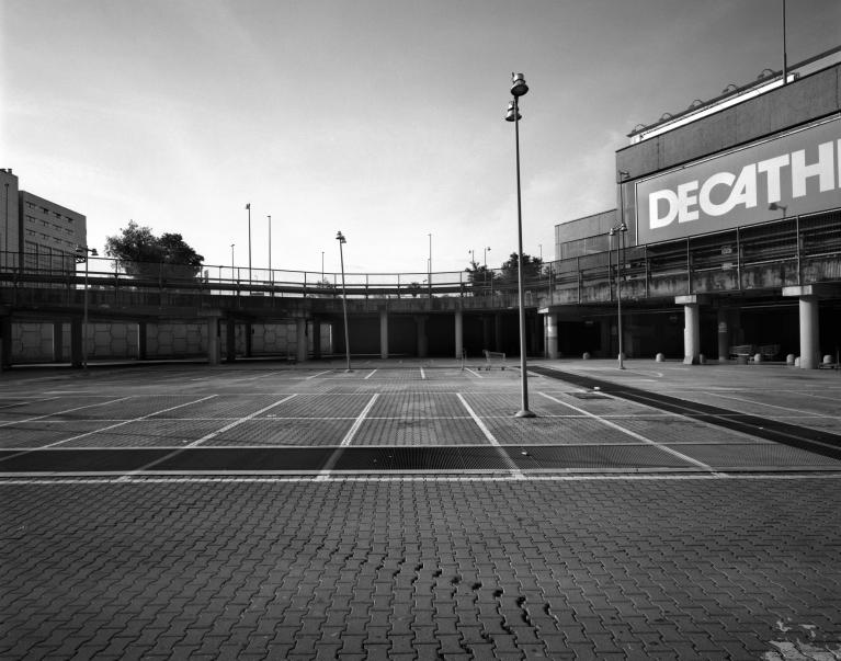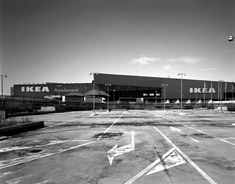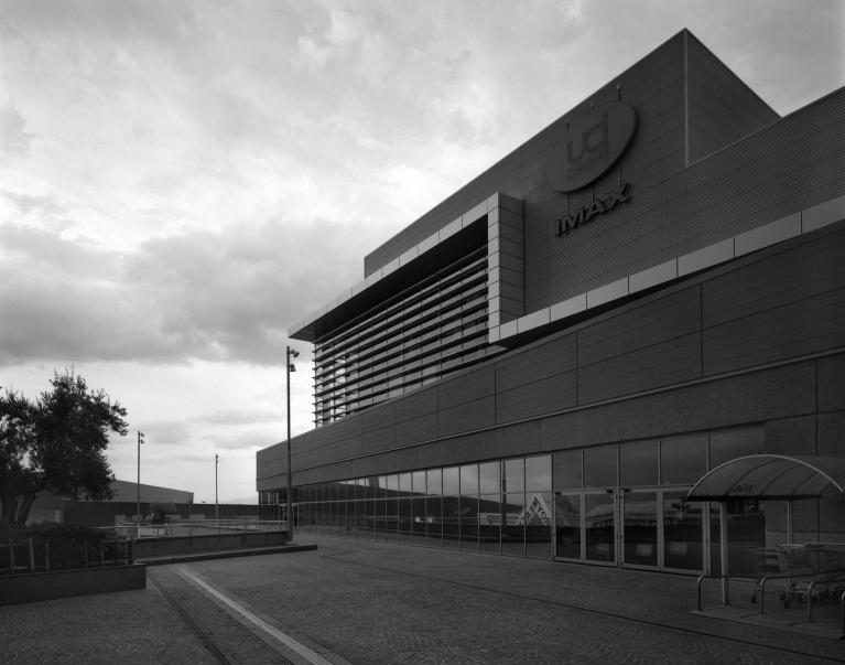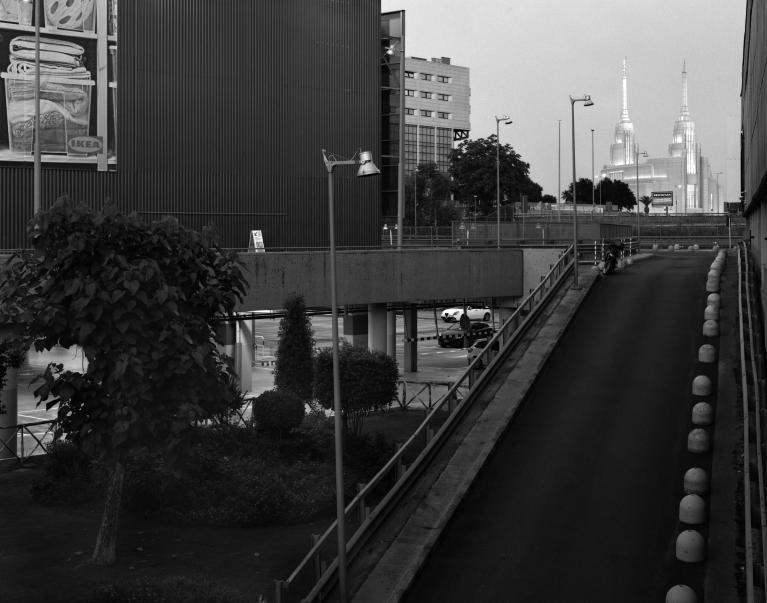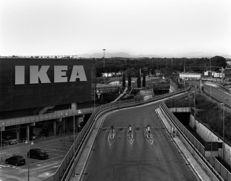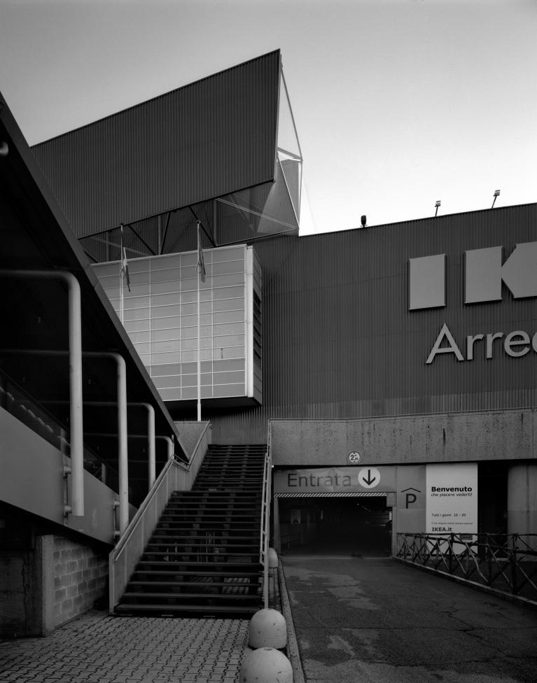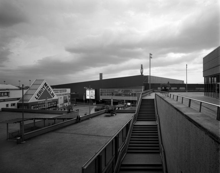 FD – La ricerca della perfezione e la riproposizione di un ordine formale che pertengono alla fotografia di architettura quale strumento di indagine sullo spazio, nel caso di un luogo privo di una forma definita come un centro commerciale, richiede un notevole sforzo di interpretazione. Le architetture commerciali sono un luogo di transito per eccellenza, la loro sostanza è evanescente quanto quella delle scenografie teatrali. Al tempo stesso, in uno scenario quale può essere il confine della città di Roma, dove la metropoli prende a sfibrarsi nei nuovi quartieri che spuntano come funghi dai pratoni e dalle colline che la circondano, i centri commerciali si trovano ad assolvere a una funzione di spazio pubblico che, per quanto provvisorio, rappresenta una realtà socio-urbanistica peculiare della nostra epoca. In questo senso ho rivolto la mia attenzione agli spazi interstiziali – parcheggi, piazze, rampe di accesso, terrazze – di questa esposizione commerciale permanente che si manifesta nella forma di un'architettura improntata all'effimero, tralasciando le gallerie commerciali vere e proprie.