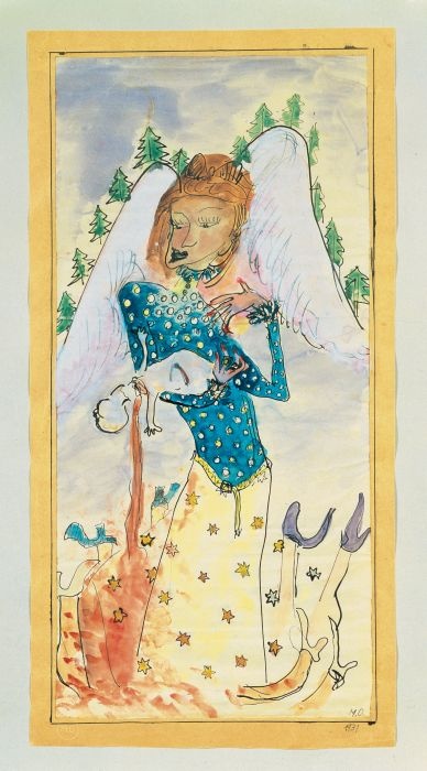 Così l’inizio: un film di Alice Guy-Blaché, La Fée aux choux (La fata dei cavoli, 1896) apre la mostra, con una raffigurazione idillica, ingenua e fiabesca della maternità-fata che raccoglie bambini da sotto i cavoli. La fata danzante, felice nel proprio ruolo, si contrappone in modo stridente al disegno di Meret Oppenheim con Votivbild (Würgeengel) [Immagine votiva, Angelo strangolatore], esposto poche sale dopo. Si tratta infatti di un piccolo lavoro del 1931 in cui la giovanissima artista berlinese rifiuta con ostentata determinazione la maternità scongiurando il concepimento.