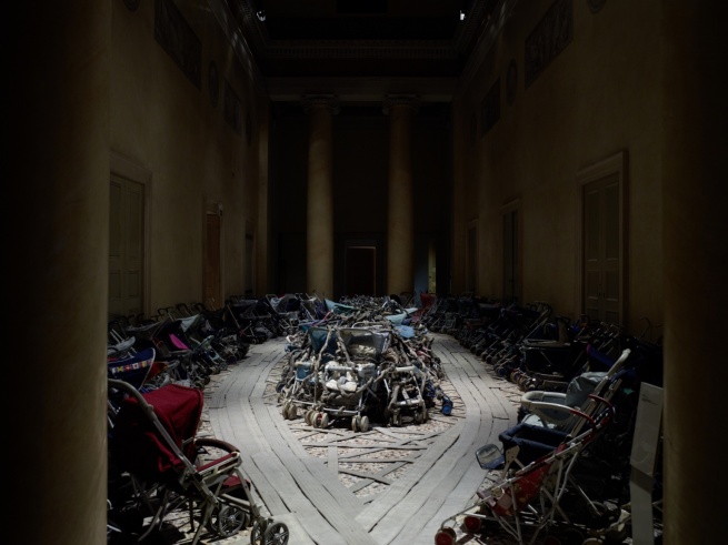 All’interno del percorso espositivo, una prima cesura temporale e tematica sembra ritrovarsi nell’opera di Nari Ward, Amazing Grace (1993), una perturbante installazione mistica in cui decine di passeggini-rottami, recuperati in strada dall’artista compongono una barca ferma all’interno di un un flusso composto da tubi per l’acqua dei pompieri di New York. Forse più un lavoro sulla speranza che sulla maternità, dove il residuo di un oggetto usato per un tempo definito e poi abbandonato si presta all’occasione.
