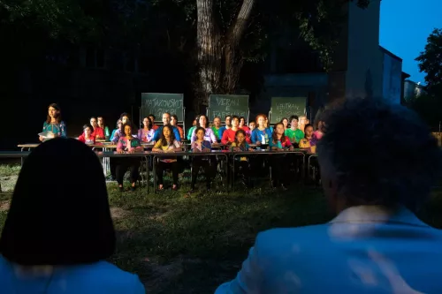 Con queste parole Ermanna ci invitava, noi spettatori/partecipanti, a diventare scolaretti, per costruire insieme un mondo nuovo. Per me, il coro dei “vermi e farfalle” è stata la scena più potente: seduti ai banchi di scuola, persone di tutte le età e di tutte le razze declamavano, urlavano o sussurravano in varie lingue i versi di Dante e di altri poeti. Una prova profonda dell’umanesimo dantesco si dispiegava davanti ai nostri occhi! E ancora una volta, una prova che l’estetica può essere politica. “Non tutte le affermazioni politiche che condivido sono esteticamente valide, ma quasi tutte le espressioni teatrali che hanno un impatto estetico su di me hanno una potente carica politica”, ha detto la critica teatrale Marina Davydova nel suo discorso di apertura della sezione russa del Golden Mask Festival 2021. Non posso che essere d’accordo con lei.
