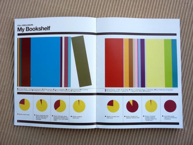 A prima vista Super graphic – a visual guide to the comic book universe (Chronicle, 2013) di Tim Leong potrebbe sembrare un libro esclusivamente per i nerd del fumetto appassionati di supereroi, come rivela la libreria dell’autore in cui predominano il blu dei DC comics, il rosso della Marvel e il giallo pallido di Vertigo, in mezzo a un arcobaleno di editori commerciali e indipendenti.