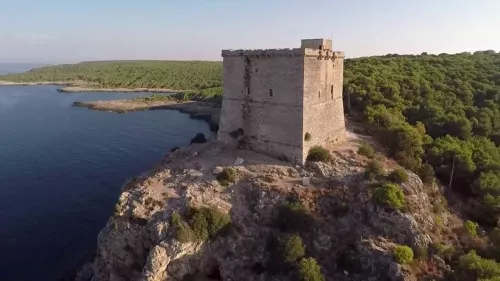 Se la Torre dell’Alto si leva su un piccolo promontorio, ed è l’avamposto di un tratto di costa rimboschito, la torre di Sant’Isidoro sorge su una bassa scogliera, di fronte a una piccola isola. Tra l’una e l’altra torre, dopo Porto Selvaggio c’è una torre diruta, Uluzzo, sotto la quale un declivio di pietroni e cardi spinosi finisce con scogli aggettanti sul mare: c’è stata qualche stagione giovanile in cui avevo l’abitudine, che ora mi pare inverosimile, di raggiungere quegli scogli per tuffarmi dall’alto nella trasparenza delle acque.