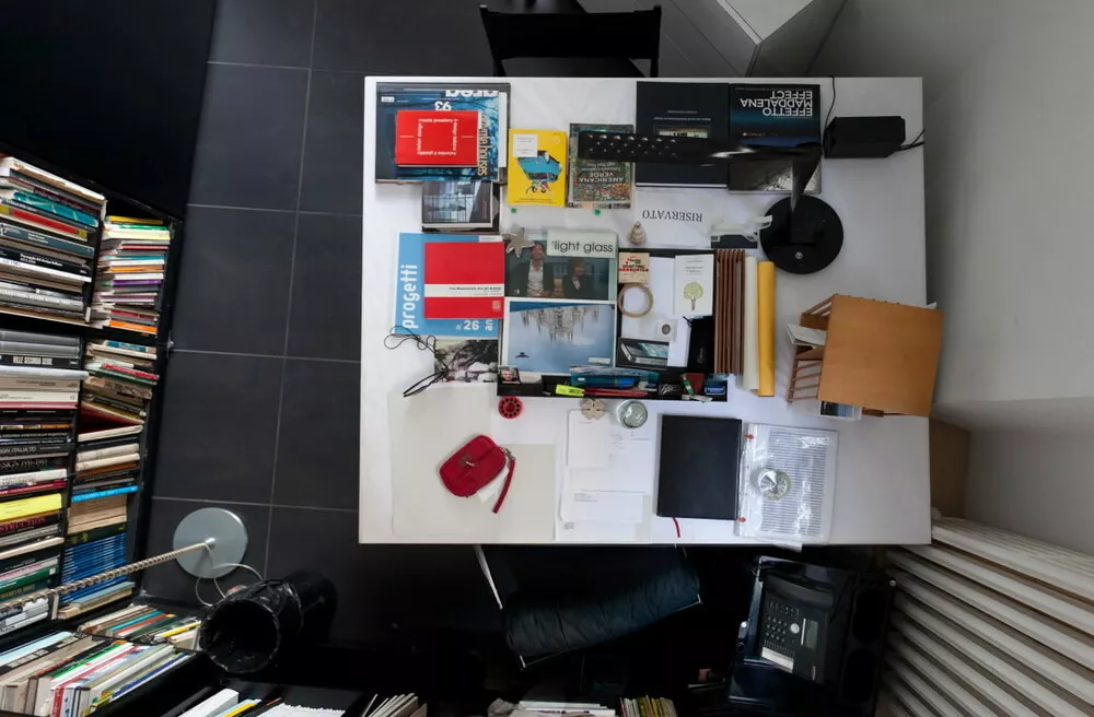 A un primo sguardo, il punctum della fotografia sembrerebbe consistere nel foglietto ripiegato che sporge dal borsellino rosso, all'angolo sinistro in basso dell'immagine. Lista della spesa? Ricetta medica? Appunto volante? Schizzo di progetto? Non è dato saperlo. Di certo la sua presenza sul tavolo da lavoro di Cini Boeri non è casuale, come non è evidentemente casuale nessuno degli oggetti che si trovano su di esso. Unicamente, a differenza degli altri, questo non lascia trapelare la ragione del suo essere lì.