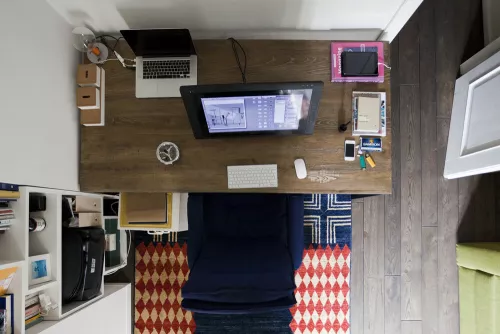 È quello fatto di questi stessi oggetti, leggermente disallineati. Lo schermo che riflette la luce della finestra, una scatola ha il coperchio girato dal lato opposto alla sua gemella, un libro non ha il dorso allineato con il suo compagno.