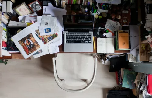 Il tavolo è collocato vicino a una finestra, da cui entra una luce di taglio, sta al fondo di uno studio, rivestito di libri, fino al soffitto. Lo schermo del computer ne riflette una sezione, come il pomello della sedia del ritratto di Leone X di Raffaello, rimanda tutto il sontuoso microcosmo papale di cui il quadro celebre racconta il fasto. Il proprietario accumula riferimenti, immagini, ritagli e prende appunti su un quaderno cecoviano: si intravedono anche gli strumenti per il rito della pausa. Pipe, in assortimento, e una scatola di sigari, ovviamente toscani.