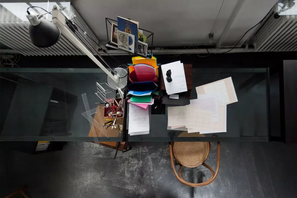 Non poteva esserci immagine più eloquente di questa fotografia per descrivere il tavolo di Giulio Paolini: una visione perfettamente prospettica, con il punto di fuga centrale, sottolineato dalle linee della lampada e dei termosifoni, che trascina vertiginosamente il nostro sguardo al centro del tavolo. Come in Disegno geometrico, la sua prima opera da cui derivano tutte le successive, la squadratura geometrica rappresenta, o meglio “presenta”, il quadro che contiene tutti i possibili quadri. A ben guardare la foto, la squadratura e la visione prospettica sono presenti anche nei disegni appoggiati in ordine sparso sul piano di lavoro, come a voler suggerire un rispecchiamento, una doublure tautologica del nostro guardare che raddoppia lo spazio reale nello spazio rappresentato.