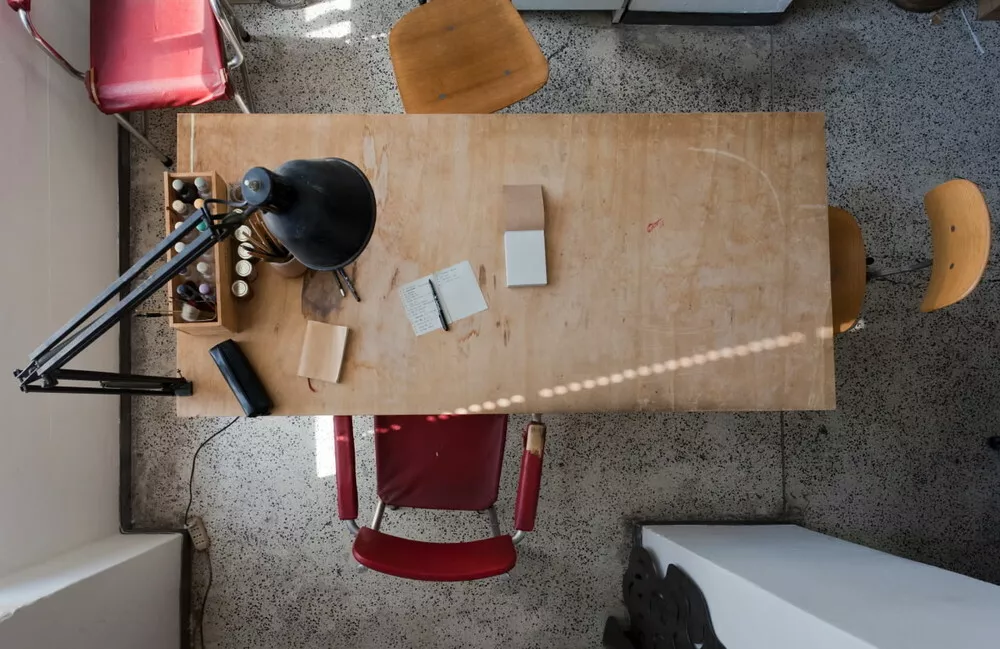 Spazio nudo, mentale, spirituale, il tavolo che vediamo in questa fotografia, spazio di pensieri da mettere sulla carta in figure e colori che aspettano di essere condivisi. Dietro il tavolo c’è una scala rossa, ai piedi del muro bianco una sagoma nera. Immaginiamo che ci sia un momento in cui le fantasie solitarie hanno bisogno di corpi che salgano su quella scala, incollino grandi fogli alla parete, ritaglino le sagome da una lastra di compensato, come nell’officina di un artigiano. L’usura del pavimento ci dice che in quello spazio si cammina molto, ci si alza e ci siede frequentemente su sedie rigide, giusto il tempo di capire cosa bisogna fare quel giorno a bottega. Tante sedie parlano di un lavoro che comincia in solitudine, ma arriva a compimento con l’aiuto degli altri, persone con cui parlare, scambiare idee, urtarsi negli spazi stretti, sostenersi mentre si sta in bilico sull’ultimo gradino di una scala. Tavolo di poche pretese e di grandi slanci del cuore, quello di Guido Scarabottolo. Illustratore.