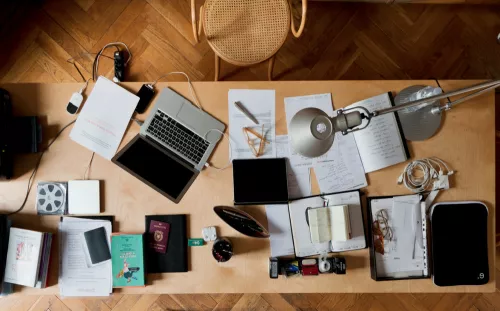 La fitta rete di strumenti di ultima generazione a occupare soltanto una metà del tavolo, attraversata dalla linea di cavi che li connette l’uno all’altro, senza intrecci né nodi né brusche deviazioni. A rispondere, dall’altro lato, senza cesura alcuna, come graduale metamorfosi, fogli accanto ad altri fogli, una calligrafia ordinata, un raccoglitore di carte. Un’agenda piccola, da viaggio, in braccio a una più grande, stanziale. E appunti, disordinati quel tanto che basta perché emerga la differenza tra loro e il quaderno di bella copia che li raccoglie.
