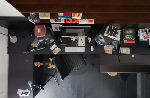 C’è una chitarra. Un microfono. Un computer e due signore casse e cuffie professionali per l’ascolto. Cd. Libri.