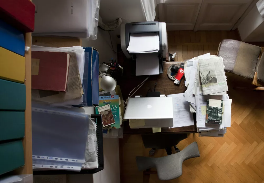 Ma ciò che colpisce di più, della fotografia, è la posizione del tavolo nella stanza, tutto addossato alla parete. Con ogni probabilità non è la parete con i suoi contenitori in cartone colorati, con i suoi dossier in bustine trasparenti, ad attrarre il tavolo. E’ la porta-finestra che si intravede nella parte alta della fotografia a condizionarne la posizione. Dietro alla porta-finestra dovrebbe esserci un balcone: c’è qualcosa da vedere, si direbbe. Una poltrona lì accanto sembra confermarlo: ci si siede a leggere, perché c’è più luce, ma anche perché c’è da guardare.