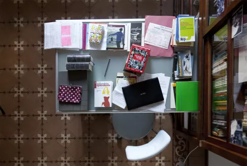 La mappa concettuale della regista non si configura come una rete di link virtuali (non a caso, forse, il pc portatile è chiuso), ma come un ipertesto materiale e tangibile. Libri, documenti cartacei, matite, dvd sono disseminati lungo tutta la superficie senza che sia ricercato un ordine tra temi e discipline. A testimonianza di un lavoro dislocato simultaneamente su più versanti, che peraltro sembrano convivere senza alcuna contraddizione. Il cinema come arte da praticare e diffondere (l’ormai imprescindibile manuale audiovisivo The Story of Film di Mark Cousins, ma anche il documentario Being You, Being Me dell’esordiente Alexandra Kaufmann), la letteratura (si scorgono le coste di due Meridiani), la politica (L’Italia post-populista di Ilvo Diamanti, Stefano Rodotà e Gustavo Zagrebelsky), le preoccupazioni della vita di tutti i giorni (le impegnative mediche). Il tutto a parlarci di una poesia del quotidiano che, parafrasando l’amata Antonia Pozzi, ci (ri)guarda.
