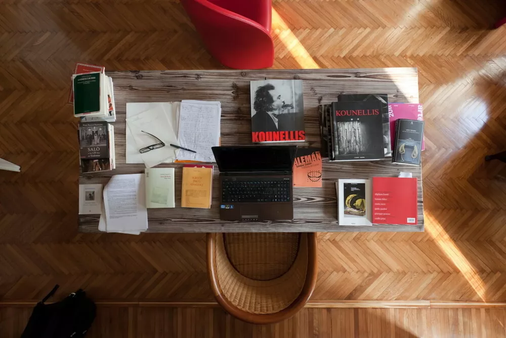 Il tavolo dell'analista non è dunque il tavolo di chi prova a produrre l'evento del pensiero con l'accumulo del sapere è invece il tavolo di chi opera coi detriti dell'atto analitico: quel sapere che viene fatto in frantumi durante l'analisi. Se infatti l'analisi produce un pensiero non è dell'ordine del sapere, ma di quello della verità. E su questo tavolo vediamo tanti libri che hanno attraversato in modo singolare quella particolare esperienza del pensiero che è la psicoanalisi: Victor Tausk il cui suicidio a quarant'anni fu una pietra dello scandalo del primo movimento psicoanalitico; un lacaniano "militante" e di sinistra come Jorge Aleman; una žižekiana à la page come Alenka Zupančič, ma anche un filosofo molto vicino alla psicoanalisi come Silvano Petrosino. Ma vediamo anche ampiamente rappresentata quella procedura di verità eterogenea al sapere che è l'arte con Kounellis, le interviste ai protagonisti del movimento dell'Arte Povera, il libro sulla mostra dei post-classici e il Salò di Pasolini.