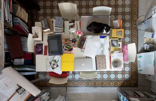 Il retro di una cartolina, un foglio dal titolo “Passioni”, un dvd che porta scritto il nome “Sonia” e qualche dispensa, di quelle rilegate a mano simili a quelle degli studenti universitari, sembrano appoggiate sul tavolo in una sorta di limbo in attesa di essere smistate e sistemate altrove. Un computer e un paio di blocchi per gli appunti, invece, paiono essere gli altri attrezzi del mestiere: quasi armi per addentrarsi nel conflitto della scrittura. Due portapenne stracolmi aiuteranno in questa missione. Da questa intensità di oggetti vediamo anche spuntare due fiorelloni di carta, uno bianco e uno rosa, a dare vivacità e allegria al mondo delle carte. C’è anche un musetto che guarda verso l’alto con gli occhioni sbarrati: familiarmente appollaiato in una scatola, il gatto sembra starsene lì a fare da fedele custode al tavolo.
