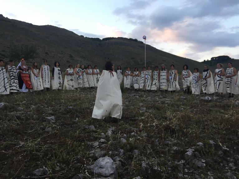 L’ipotesi di lavoro diventa quindi l’accogliere la specificità del territorio, che in questo caso è costituito da una morfologia acustica anomala, e declinarla attraverso una riflessione inedita sul paesaggio inteso anche nella sua accezione di sistema transitorio, nel quale la presenza umana è parte costituente anche quando vive la condizione di ospite, quando non appartenente. Da qui la scelta di far incontrare voci dal retroterra differente: da una parte il gruppo fondato da Meike Clarelli “Le Chemin Des Femmes”, proveniente dall’Appennino Nord, a cui si sono aggiunte le donne del coro “Kamaraton” di Camerota e quelle di “Vivat” di Lentiscosa, ognuna chiamata a partecipare indossando un costume tagliato e dipinto da Antonio Marras, amico e già partecipe delle sperimentazioni tessili di Losi.