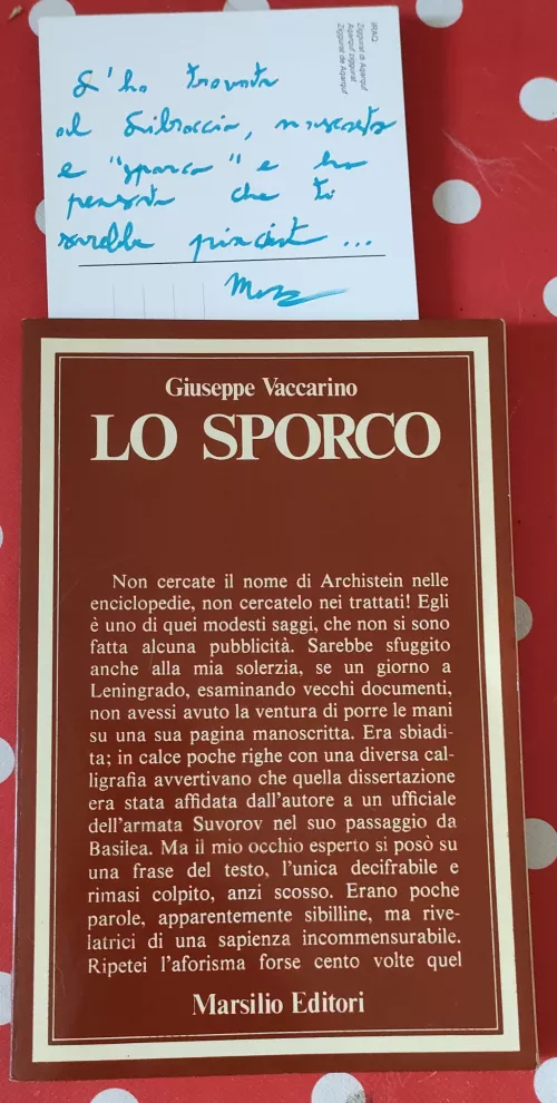 Dunque il nostro protagonista scopre a Leningrado, era il 1977, si chiamava così, un frammento manoscritto di un fantomatico e misterioso Archistein. Seguirne le tracce lo porta a Basilea, dove attraverso avventure rocambolesche viene a sapere che il filosofo e chirurgo era stato cacciato dalla città per aver asserito, evidentemente una bestemmia che chiama il patibolo, in Svizzera, che “nessuno ha mai visto e toccato lo sporco, poiché esso si intende solo con la mente”. Poco dopo egli stesso viene cacciato dalla città, e si ritrova in un paese in cui le tracce della presenza di Archistein si moltiplicano, i locali si rivelano relazionalmente problematici almeno quanto lui, questo innesca ulteriori avventure in cui ricorre in connotazioni, forme e sensi differenti lo sporco come tema dominante. Il libro è anche occasione per apprendere frammenti di erudizione, Vaccarino è stato anche docente di Filosofia antica, e discettando di affinità e differenze tra porco, sporco e sporcaccione, ci imbattiamo in Prodico, misconosciuto confutatore dello Stagirita, che sosteneva non esistessero parole esattamente sinonime. Le vicende divengono sempre più vorticose, la trama sempre più sporca, fino al disvelamento finale della sorte dei manoscritti di Archistein. Questa è la storia, protagonista assoluto lo sporco, in filigrana la semantica operativa. Un gioiellino.