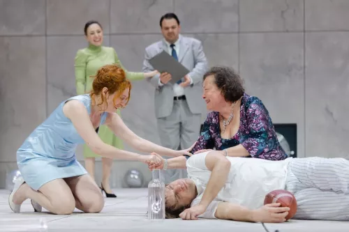 La bella traduzione è di Monica Capuani: dura in certi passaggi, è capace di ritrarre personaggi fattisi da sé o arrivisti con sfumature linguistiche che vanno dalla volgarità al linguaggio avvocatesco, dall’affettato bon ton all’esplosione di umori, per rendere una molteplicità ancora maggiore, dialettale, dell’originale. In quella scena di marmo, palloni di football americano, pigiami, sottovesti, abiti con cravatta, una giovinetta simile a un trickster o a incarnazione dell’ossessione per la mancanza di figli (Greta Petronillo), un prete che raffigura un’altra delle parti ipocrite della società (Nicolò Tomassini) e poi specchi, bottiglie, palloncini portati via dal vento (suono di Claudio Tortorici) di un metaforico, turbinoso temporale interiore che incrina la festa, con attori meravigliosi che danno sudore, dolore, entusiasmo, ipocrisia, disperazione ai personaggi. In un ensemble sempre convincente, spiccano la furia e la passione avvolgente di Valentina Picello, la distanza ferita di Fausto Cabra, la speranza e il dolore fatti corpo pesante sotto un vestito luccicante di Orietta Notari, la possanza da antico patriarca esposta all’oltraggio della vita di Nicola Pannelli.