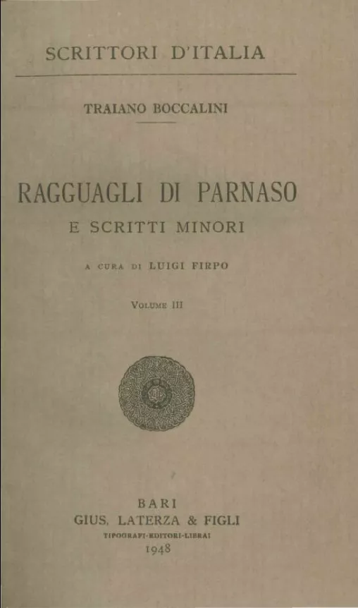 Edizione di riferimento: Traiano Boccalini, Ragguagli di Parnaso e scritti minori, Laterza, Bari 1948