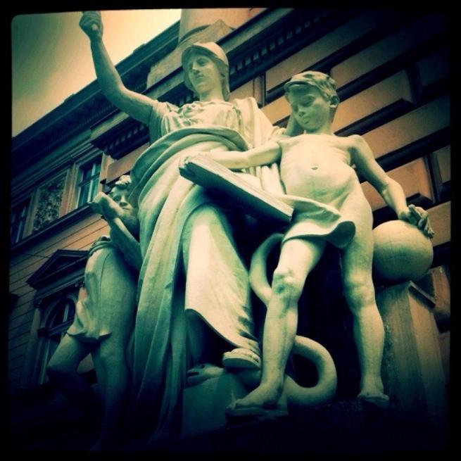 Mi sono chiesta spesso in quei giorni, come dovesse essere la vita del signor Jan. Cosa volesse dire vivere in una città in cui, da un giorno all’altro, i nomi della strade vengono scritti in un altro alfabeto e nessuno parla più la tua lingua. E mi sono anche spesso chiesta come dovesse essere vivere lì per chi a Leopoli ci è arrivato. Per gli ucraini, per i russi. Come dovesse essere girare per strade e piazze che parlano di una storia che non è la tua. I palazzi del centro portano ancora tutti gli stemmi nobiliari delle famiglie polacche che un tempo li abitavano (palazzo Potocki, il più bello di tutti, lo riconosco subito dallo scudo con croce a cinque braccia in campo azzurro). In un palazzo verde dietro il Municipio, i busti di Mickiewicz, Kochanowski, Fredro fissano i passanti con aria benevola. Li avranno riconosciuti i soldati russi, entrando in città, nel ’45?
