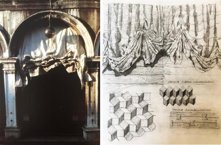 A sinistra: Procuratie Vecchie, foto di Peter Seipelt A destra: Robert Haussmann, Schizzo per H-design per MIRA-X, 1981.