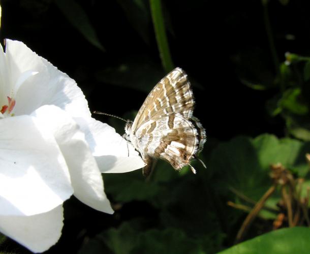 Sapevo da un paio d’anni che se ne erano trovate alcune anche in Italia, ma la sorpresa fu di osservare il Cacyreus marshalli, la “licena bruna dei gerani”, anche ai Giardini Pubblici di Biella nel 2005. Questa specie appartiene alla nostra fauna europea da una dozzina d’anni, essendo originaria dell’Africa australe: Sudafrica, Mozambico e Zimbabwe.