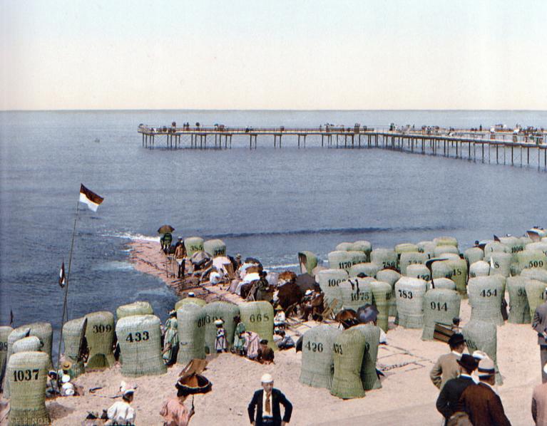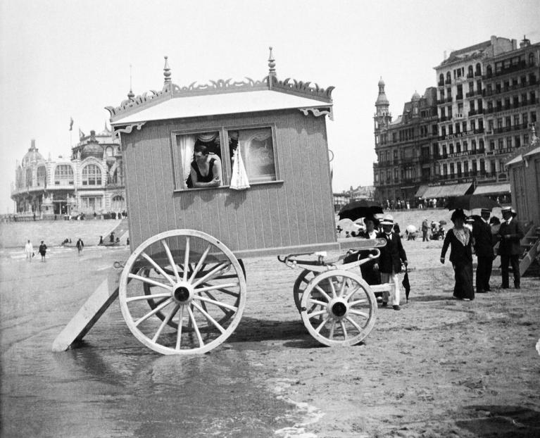 L’ambiente marino supposto selvaggio, il paesaggio nudo e crudo, gli elementi naturali esigono quel minimo di supporto tecnico che possa farli godere al meglio: non foss’altro che una strada ferrata atta a unire città e mare, smog e aria pura, cultura a natura; o, ancor più, una carrozza a cavalli dove privarsi degli abiti civili, indossare il costumone a strisce (tutt’altro che adamitico) ed entrare in acqua al riparo da sguardi indiscreti. Susanna senza vecchioni. D’altra parte, ecco tutto un programma di costruzioni e di investimenti, di progettazioni e di speculazioni. L’ambiente marino diviene un luogo formidabile per l’invenzione architettonica, la sperimentazione urbanistica, la (ri)costruzione funzionalista del paesaggio. Come mostra la straordinaria esposizione parigina “Tous à la plage.