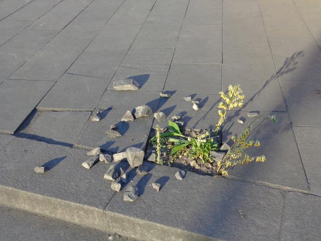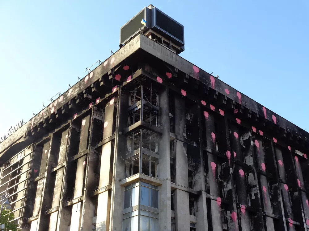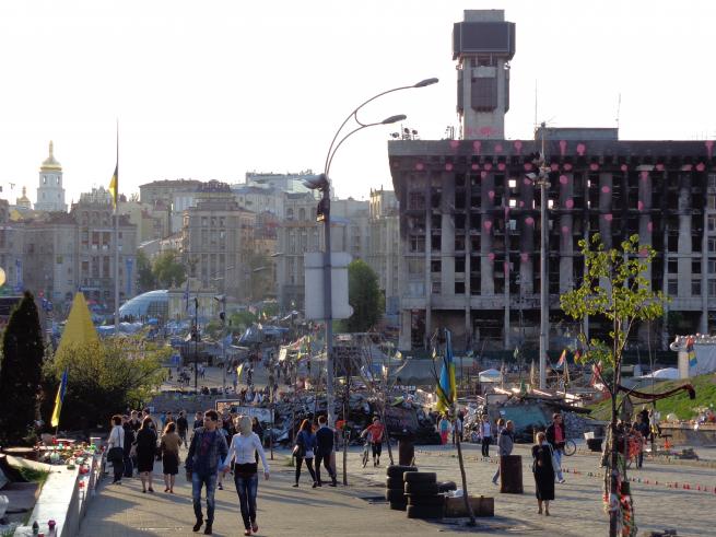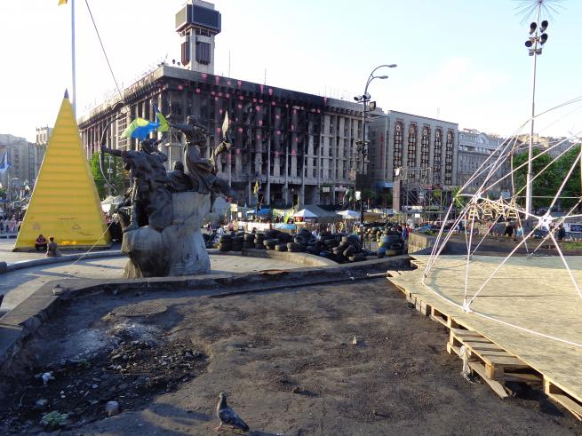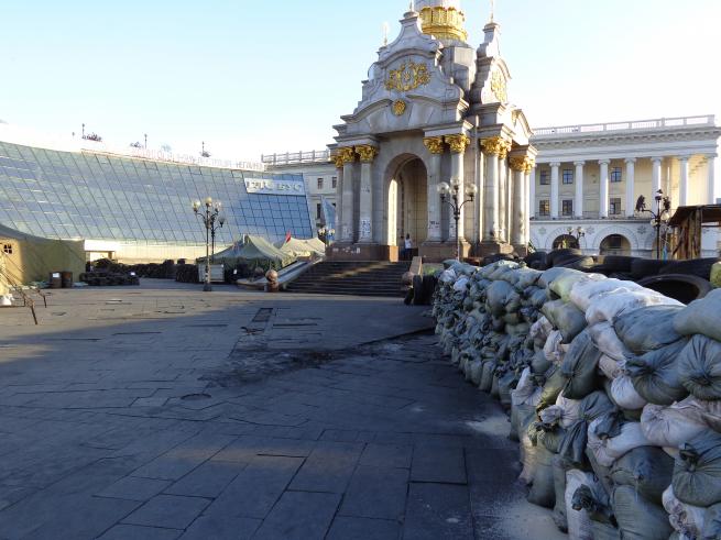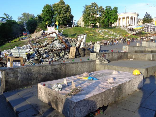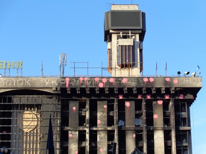 Si alza lo sguardo verso il palazzo dei sindacati e la sua torre spenta che segnava le ore, i giorni, le temperature, ricordava il tempo, con il suo carillon: si scorgono solo i rami neri lasciati dalle fiamme sulla pietra, come braccia sospese di chi non si è salvato; nella notte dell'assedio furono sparati proiettili incendiari verso il primo e l'ultimo piano, così da intrappolare nell'incendio, senza scampo, tutti i feriti ospitati nel palazzo; da quel punto, sino alla colonna centrale del Maidan, si cammina su polveri bruciate, ceneri, fuliggine: resti dell'incendio delle barricate, che hanno resistito alla pressione dei Berkut, alla massa degli agenti che attaccavano la piazza; per un'irreale ironia della sorte, le telecamere funzionavano, e dai computer si potevano seguire gli eventi, gli scontri, le fiamme, i plotoni dei Berkut schierati in attesa, sotto il ponte metallico della Institutskaia; un'intera notte di battaglia, cedendo solo pochi metri all'assalto degli agenti, conservando sino all'alba il cuore della piazza.