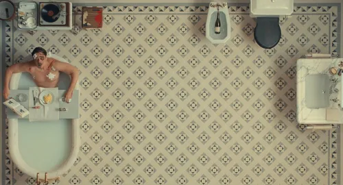 In essa, il busto di Benicio Del Toro, principale protagonista nel ruolo del magnate apolide Zsa-Zsa Korda, fuoriesce da una vasca, con le braccia incrociate, mentre ha lo sguardo rivolto a qualcosa che attira la sua attenzione di fronte a lui. Quella posa ha qualcosa di familiare, che riporta alla mente Asteroid City del 2023 (sempre presentato a Cannes, sempre con un'accoglienza tiepida). Due immagini in particolare: Scarlett Johansson immersa nella vasca della sua stanza; sempre lei, in posa pensierosa, con le braccia incrociate e lo sguardo rivolto verso l'orizzonte (è una delle immagini emblematiche del film di due anni fa; la prima che salta fuori nei motori di ricerca scrivendo il titolo del film e il nome dell'attrice). Questi collegamenti subliminali sono un effetto collaterale dell'attendersi a priori una reiterazione stilistica? Johansson ha un piccolo ruolo anche in questo film: ancora una volta, tutto torna (e tanti ritornano).