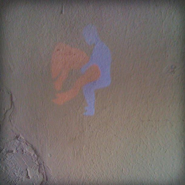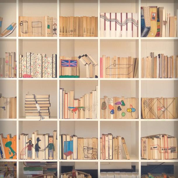E di fianco una libreria, con i libri a dare le spalle, come per protesta. O dissenso culturale. E sopra scarabocchi anarchici, come a scuola, sghignazzano un’altra storia e un’altra umanità: più innocua.
