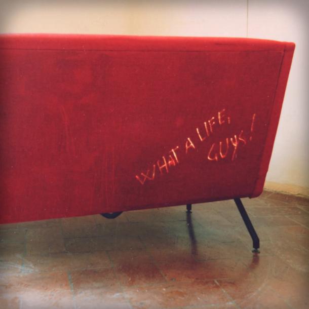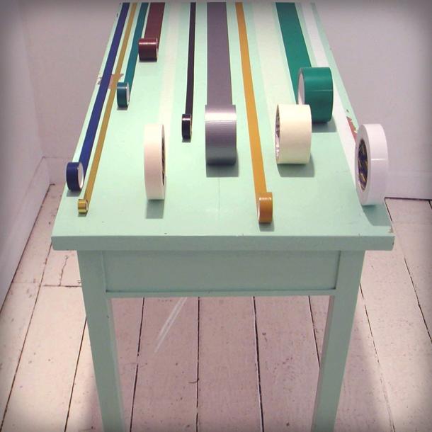 Dietro una piccola tenda, fatta di cartine di sigarette incollate una sull’altra come una fisarmonica di carta, un soggiorno con un divano rosso graffiato dal cane. E un tavolo su cui nastri adesivi si rincorrono come atleti, in gara, a chi arriva prima. Inutili e vacui, come tutte le competizioni.