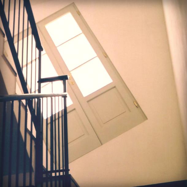 Sale su, per le scale di legno. Una finestra sembra indicare sbilenca la pendenza dell’ascesa e della fatica.