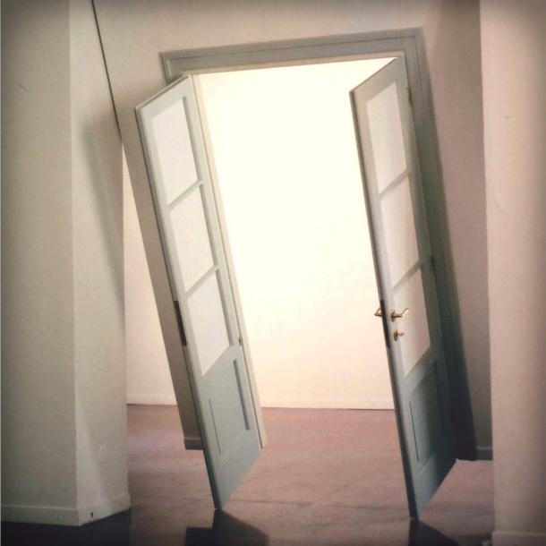 Dietro il tavolo una porta. Attaccata al muro, come un'altalena, dondola prima di aprire i battenti.