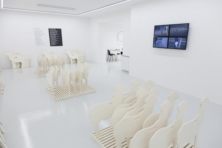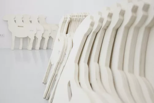 Adozione della pecora è il nome della prima “agenzia”. «Sull’importanza, oggi, di ripensare la pecora» è in sintesi la chiave di volta su cui si sostiene l’operazione. Cento pecore sono esposte come in una showroom. Disposte sopra appositi espositori, griglie e mensole, le pecore sono sagome di legno compresso. Ognuna è timbrata, firmata e numerata. Ognuna è un’opera multipla, con la surreale e mistificatoria funzione di accompagnarci nelle nostre giornate, al parco, alla posta, al supermercato. Video promozionali ne illustrano i possibili usi. Altre immagini si riferiscono all’originale, che ne ha ispirato il surrogato. Compreso nell’acquisto un decalogo di buone maniere ad uso e consumo del collezionista per una nuova consapevolezza del mite animale in attesa di qualcuno che lo acquisti. Pardon: che lo adotti.
