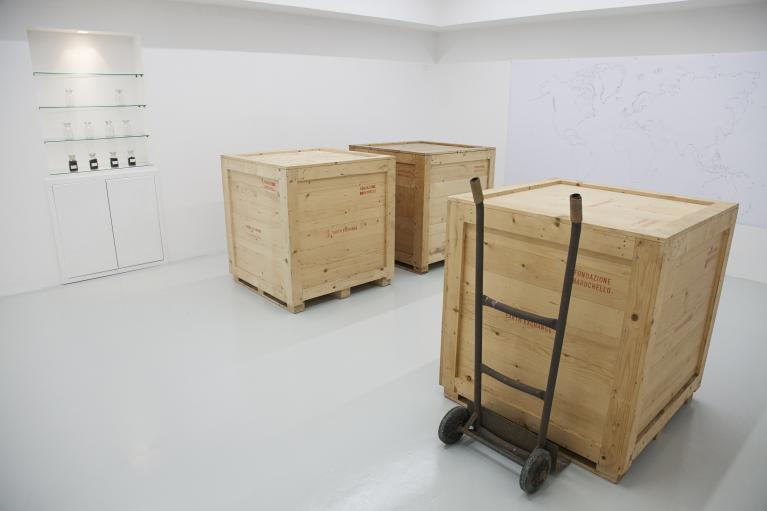 Anche per questa agenzia il luogo di partenza è la tenuta di via Cornelia. Dall’allevamento del bestiame alla coltivazione della terra, la seconda agenzia riguarda un progetto inaugurato nel 2008: uno scambio di terreno tra aziende agricole. In tempi di sharing economy, cioè economia generata non dall’impresa, ma dalla condivisione di azioni quotidiane che svolgeremmo comunque – come dare un passaggio a qualcuno mentre andiamo al lavoro in auto o ospitare chi ne ha bisogno a casa nostra in cambio di un rimborso spese –, qui si parla di condivisione dei terreni, con la particolarità che in questo caso per essere scambiati questi devono corrispondere a determinate caratteristiche chimiche. «Custode dei valori antichi e patrimonio del vivente», la terra può generare o meno la vita. Le due casse dentro la stanza custodiscono a lor volta lo scambio di terreni. Una piena del terreno di via Cornelia, l’altra vuota sono inviate entrambe a una seconda azienda, da cui usciranno entrambe riempite per metà del terreno di una tenuta e per l’altra metà di quello della seconda tenuta con cui è avvenuto lo scambio. Entrambe le tenute diverranno a loro volta custodi di una delle due casse contenenti il terreno condiviso.