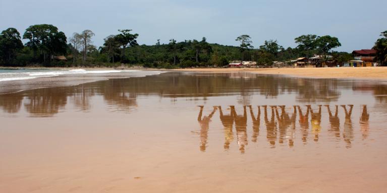 J.E - Come già accennato, nel mio lavoro miro a ottenere un’espressione visuale discreta che al tempo stesso implichi una significativa complessità. In Atlantic (Endless Row) l’immagine viene manipolata, così da cancellare alcuni elementi molto importanti. Le foto, scattate su una spiaggia in Ghana, mostrano sulla riva il riflesso di una fila di persone che camminano verso l’acqua. L’unico elemento visibile è il loro riflesso.