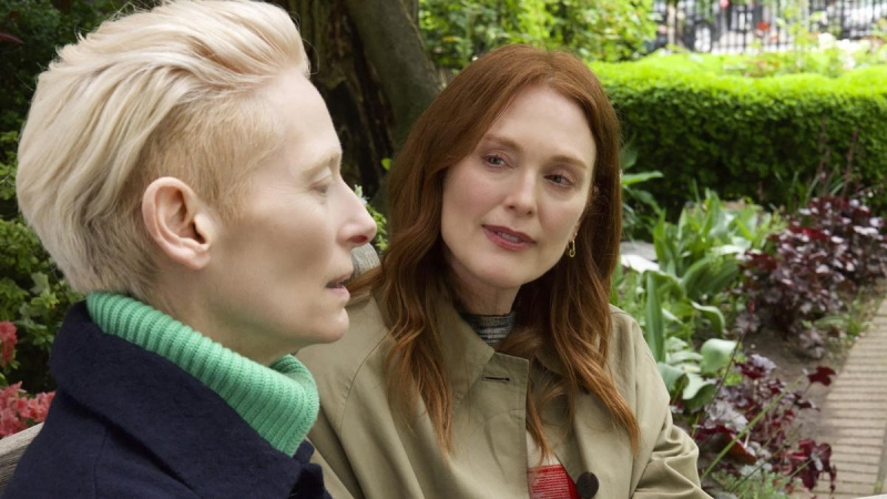 Ingrid (Julianne Moore) invece è stata al riparo, a scrivere romanzi, diventando famosa. Le due donne si ritrovano dopo molti anni, quando arriva la notizia che una delle due, Martha (Tilda Swinton), ha una malattia terminale e Ingrid va a farle visita: l’ospedale è lo spazio in cui si ritrovano, e da cui in un certo senso si metteranno in salvo. Anche stavolta la loro diversità si confronta e si completa, specchiandosi anche nel nostro sguardo. Così assistiamo e partecipiamo a un racconto che dà vita alla paura di morire, quella di Ingrid, messa accanto e fatta incontrare con la paura di vivere senza dignità di Martha, che di fronte all’ennesima terapia ormai inutile decide di spostarsi e reinventarsi un percorso di fine vita, cercando una casa bellissima in mezzo al bosco dove andrà a abitare per un mese, fino a quando, solo quando vorrà e saprà lei, ingoierà una pasticca letale. Non sarà sola però: nella casa sarà insieme a Ingrid, che inizialmente è sorpresa e turbata («Don’t you want someone closer?» le chiede), ma poi accetta la proposta di dormire nella stanza accanto. Senza assistere direttamente all’evento, in questo modo potrà infatti sistemare le cose, una volta che l’amica avrà messo fine alla sua esistenza, scivolando via, con una scelta che metterà in armonia vita e morte, come la neve, nel finale del racconto di Joyce I morti (ripreso più volte nel film, e che funziona come tema ricorrente), che cade lentamente «upon all the living and the dead».