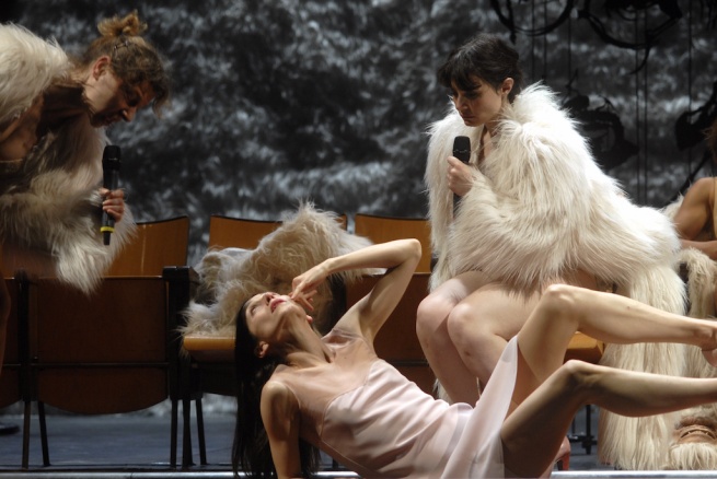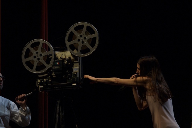Sforziamoci almeno per un momento, con pazienza, di osservare nel dettaglio la drammaturgia: luci accese in sala, sul fondo un telo di pelliccia bianca, in scena una fila di sedie di legno da vecchio cinema-teatro, sulla destra una macchina da presa retrò. Una donna magra, diafana, con una sottoveste cipria coperta da un cappotto rosso, interviene in proscenio, senza microfono, sul vocìo del pubblico appena arrivato e nell'invocare l'aiuto degli spettatori – "Aiutatemi a regalarvi la mia morte", "scommetto che non avete letto neanche il programma di sala" –, ci consegna il primo livello: ricordiamoci di ricordare durante lo spettacolo che siamo a teatro. Seduto in platea un uomo fa una radiocronaca sportiva; è il corrispondente Robert Krohn, siamo in un ippodromo a una corsa di cavalli e la diretta si conclude con la morte del cavallo che giunge in fin di vita alla linea d'arrivo; un cavallo drogato, da abbattere. Abbattuto. Il secondo livello è dato. In sintesi, la premessa è più o meno questa: una donna, una morte in ballo, e una esecuzione già compiuta. Come in una tragedia classica, stiamo per assistere allo svolgimento di una morte svelata dal principio, lo spettacolo racconterà il compimento di un destino. Ma la protagonista ci sta chiedendo, piuttosto nervosamente, aiuto. "Aiutatemi a regalarvi la mia morte". Non ad arrivare fino in fondo alla storia, quindi, ma a regalarcela, a scegliere di morire per il nostro applauso. Aggiungiamo un livello: il personaggio, e la sua ribellione al destino previsto. Ma anche un altro: se ci ha chiamati in causa in quanto spettatori noi ci dobbiamo ricordare sempre che il patto di finzione è rotto, e che chi abbiamo di fronte è anche una attrice, e che ha bisogno di aiuto, vale a dire di una platea, di spettatori, per portare avanti, in quanto attrice, la missione ribelle del suo personaggio. Ricapitolando: c'è una donna che sicuramente morirà, lo spettacolo consisterà nel percorso che conduce a questa morte, ma la protagonista lotterà contro la naturalezza di questo svolgimento, esattamente come l'attrice lotterà contro il naturalismo della sua interpretazione. Fin qui, con i dovuti dubbi, e ponendo il caso di una iperattenzione a questo schema articolato di segni, tutto sembra tornare. E siamo ancora ai primissimi minuti di spettacolo.
