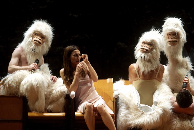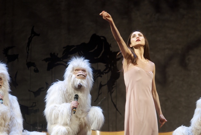 Spente le luci in platea, la pelliccia bianca sul fondo è luminosa; siamo dentro l'incubo di una drogata, in un film in bianco e nero di Fassbinder, dentro una montagna di morfina e di eroina, dentro l'inquietante clinica in cui la Voss è tenuta ostaggio da una neurologa e un'infermiera senza scrupoli. Sei scimmioni bianchi, proiezioni della sua psiche alterata, schegge della sua memoria, la circondano, la assillano, le suggeriscono i ricordi, gli snodi fondamentali non solo della storia che sta rivedendo sullo schermo immaginario, ma di quella che sta mettendo in scena in quel preciso momento, a teatro. "Brava, resta frivola, Veronika"; "devi ricordare tutto, Veronika", "ora piano, rallenta": la storia procede, mentre l'attrice prova a sospenderla di tanto in tanto, fumando una sigaretta, chiedendo una pausa. I fantasmi assumono connotazioni sempre più precise, dai costumi dei primati vengono fuori dei volti e delle voci con un nome e una funzione. Veronika sbaglia battuta, recita quella di un altro allestimento di Latella, Un tram che si chiama desiderio; sullo sfondo i tre bravissimi artisti delle ombre di alTREtracce proiettano il volto di lei, e poco dopo – sorpresa – quello del grande cineasta a cui Latella vuol rendere omaggio. Veronika/Fassbinder: sono la stessa persona, divorata dalla scimmia, che è la droga, ma anche il successo, ma anche, a un livello più profondo, il loro stesso linguaggio, la loro stessa arte. "C'è così tanta tenerezza nella mia testa, c'è così tanta solitudine nel mio letto, c'è così tanta tenerezza al mondo”: uno scimmione canta in inglese (Maurizio Rippa), Veronika, ma forse dovremmo dire Fassbinder, nel frattempo pronuncia in italiano e scrive queste parole con un gesto della mano, crea la scena che stanno interpretando. Di fronte a noi si accumulano strati su strati.