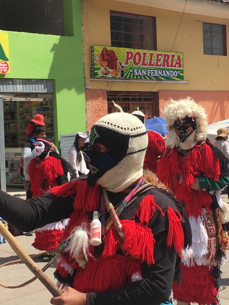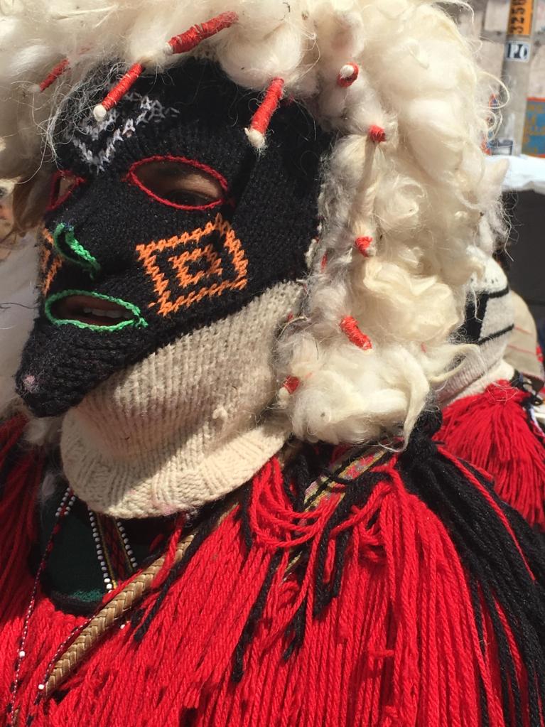 L’insieme delle maschere qui nel Valle Sagrado ha un aspetto di totale travestimento. Perfino le donne si travestono da donne con maschere di donne, alcune invece sono in gonna e blusa tradizionale, ma hanno il volto coperto da un fazzoletto nero – sono le donne nere, le schiave che gli spagnoli costrinsero a lavorare per loro nei campi e nelle miniere. E poi ci sono i bianchi, la loro caricatura in maschere dai lunghi nasi, spesso pelosi, calvi, che danzano con la bibbia in mano, il loro strumento di tortura preferito. Nathan Wachtel, nel suo La visione dei vinti ha lavorato a lungo su queste maschere queste danze, sul loro riassumere e rievocare la conquista e la resistenza india ad essa. Tra i gruppi di danza ce n’è uno che rappresenta gli indigeni dell’amazzonia, un altro con maschere di facce deformate e gialle, la bocca a o, sono gli indios che si sono presi la malaria andando a lavorare in amazzonia e che hanno una guancia deformata dal “bolo” di coca che masticano continuamente. Con Emanuele e suo figlio vivacissimo di cinque anni ci infiliamo tra un gruppo e l’altro. “Unu” questo è il nome quechua del bambino – significa acqua – tra qualche giorno avrà il suo primo taglio di capelli, che è un momento fondamentale nella crescita di un bambino. Ad esso partecipa tutta la comunità che taglia una piccola ciocca per ogni padrino membro di essa. Siamo invitati al “corte” al taglio, ci sarà da mangiare, da bere chicha, da ballare.