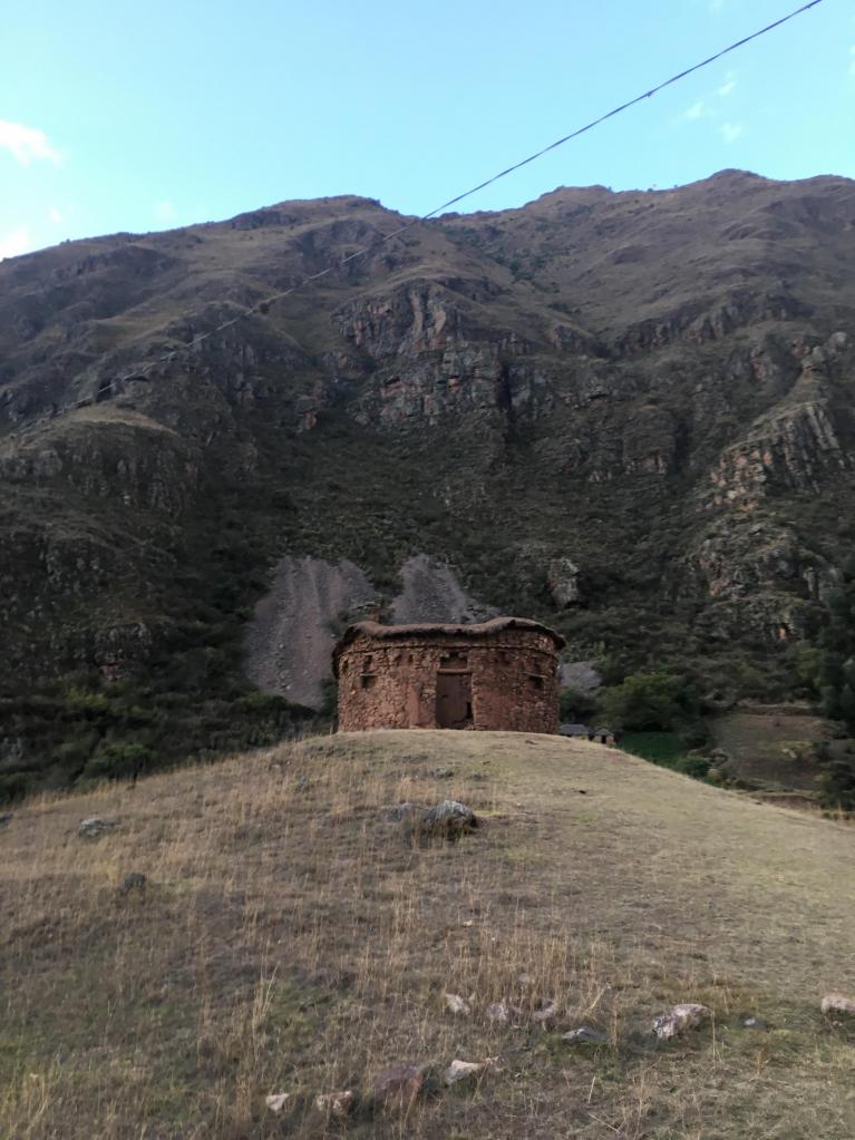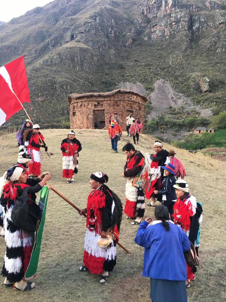 Più tardi, verso il tramonto, dopo che gli Ukuku si sono rifocillati (son due giorni che danzano continuamente) nella casa di un amico della confraternita, saliamo su un camion che ci porta a Urco, un tempio inca, al centro del Valle Sagrado. Sul camion dove stiamo fitti in piedi o gli Ukuku arrampicati sulle sponde si continua a suonare e a parlare in falsetto – lo fanno quando sono mascherati (con una naturalezza assoluta passano dal falsetto al tono normale appena si tratta di questioni pratiche, come attaccare una scala al camion o aggiustare uno strumento). Arriviamo a un tempio circolare in mattoni su una collina. È uno dei posti sacri, tantissimi, che costellano questa valle, sovrasta i resti più ampi di una costruzione di pietra dalle caratteristiche finestre svasate dell’architettura inca. Il tempio guarda una montagna ripida dietro cui durante il giorno appariva la sagoma della “Veronica” il ghiacciaio a seimila metri. Dietro di noi la valle si restringe. Siamo protetti tra due sponde di montagne. Gli Ukuku entrano con strumenti e bandiere nel tempio circolare e cominciano a danzare in cerchio. La luce del giorno si affievolisce. Qui, a tremila metri il passaggio tra giorno e notte è rapidissimo. Ma c’è ancora luce. Quando smettono le danze, il gruppo si sposta in uno spazio erboso circondato da mura, parte del tempio più sotto e in circolo si inginocchia in silenzio.