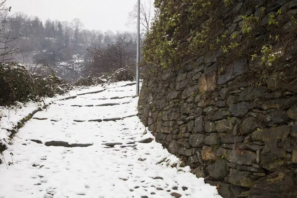 Sopra l’ospedale e sotto il Castello di Sasso Corbaro, vicino all’Oratorio della Madonna della Neve, parte una mulattiera ripida, di quelle che mozzano il fiato. Non abbiate fretta. Camminate sui lastroni di selciato, fra i muri, aiutandovi con il bastone di legno (evitate quelli da nordic walking, se potete: non sono adatti per entrare in una ghost town). Prada si presenta all’improvviso, e nessuno mi toglierà dalla testa che la prima avvisaglia sia una diversa qualità di silenzio. Forse perché acquattati in fondo al vuoto ci sono tutti i suoni che il tempo ha dimenticato quassù, e che ormai sono muti, certo, ma che lasciano come un riverbero, una sospensione.