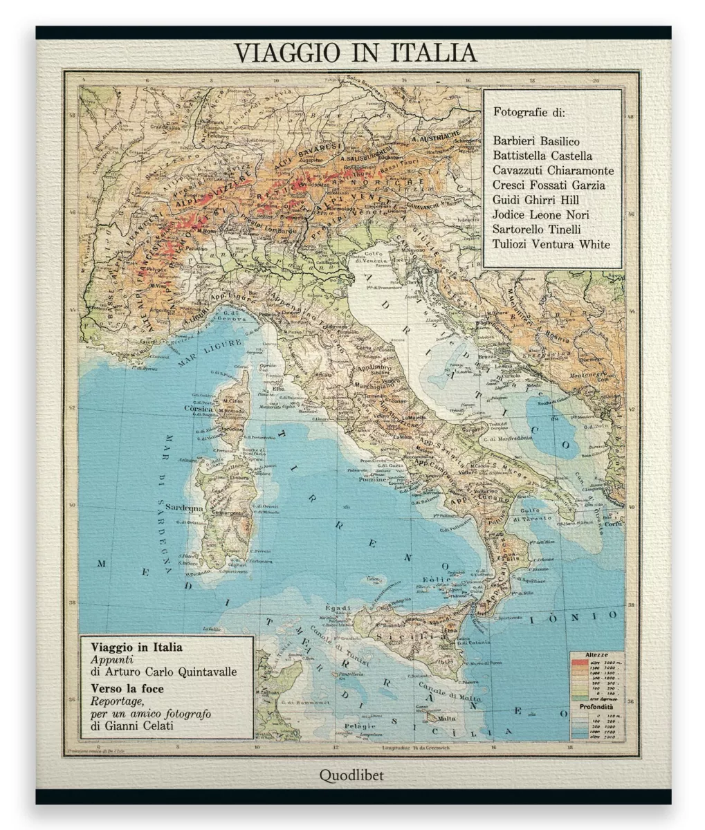 Ne hai sentito parlare per decenni, l’hai visto citato e l’hai citato tu stesso infinite volte: eppure non l’avevi mai potuto sfogliare. Viaggio in Italia di Ghirri e compagni è stato per anni un’inafferrabile araba fenice. E come un’araba fenice risorge adesso dalle sue ceneri (leggi: riproduzione in facsimile), ripubblicato da Quodlibet a 40 anni dalla prima edizione. Finalmente ce l’hai in mano e lo puoi sfogliare per compiere il tuo personale viaggio nel Viaggio. La prima cosa che colpisce è (re)incontrare un pezzo di storia di organizzazione culturale italiana che avevi dimenticato insieme alla stagione dei cineforum. Leggi che originariamente tutta l’operazione nacque sotto l’egida dell’ARCI Media e di alcune sue emanazioni pugliesi e ti viene nostalgia a pensare a come allora la cultura sapeva costruirsi dal basso perché esistevano queste cinghie di trasmissione che davano forma a idee invece che produrre “eventi”. E poi ti commuovi poche pagine in là, dopo il fondamentale saggio di Arturo Carlo Quintavalle (ma quello l’avevi letto), quando compare una breve presentazione dei fotografi che si conclude con la comunicazione del loro indirizzo e del loro numero di telefono. Già, perché nonostante si tratti di artisti dal talento cristallino, non sono star circondate dal mistero, ma lavoratori della cultura che hanno bisogno di committenze. Sarai ingenuo, ma provi commozione nel leggere quelle informazioni gettate al pubblico con fiducia e senza nessuna preoccupazione di privacy, indizio di un mondo che è esistito anche se si fa fatica a ricordarlo tale.